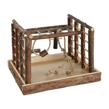 Die Bodenplatte aus Naturholz macht es möglich, dass der Spielplatz auch außerhalb des Käfigs zu einem ideal Anflugplatz wird.