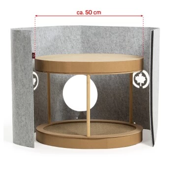 Der Aufbau mit zwei Etagen ist dabei aus leichtem und doch robustem Holz. Die anschmiegsame Filzumrandung der Katzenhöhle wird über das Holzgestell, kombiniert mit den Kratzflächen überstülpt und schafft somit einen stabilen und formfesten Aufbau des Katzenmöbels.