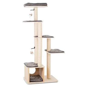 Die vier Kissen und das Bettchen sind mit Klettverschlüssen befestigt und waschbar. So behält das Möbelstück seine Ausstrahlung und bietet der Katze immer wieder einen sauberen Rückzugsort. Der Kratzbaum umfasst eine tiefe Höhle mit Kuschelkissen und vier Liegeflächen. Die Stämme sind mit hochwertigem Sisal versehen. An zwei Stellen wurde eine Spielmaus befestigt, die noch mehr Spielspaß garantiert und die Katze zum Kratzen anregt.