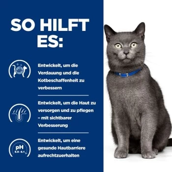 Hill’s Prescription Diet d/d Feline Ente und grüne Erbsen wurde entwickelt, um zu helfen, allergische Reaktionen auf Futter zu reduzieren und die Hautgesundheit zu unterstützen.