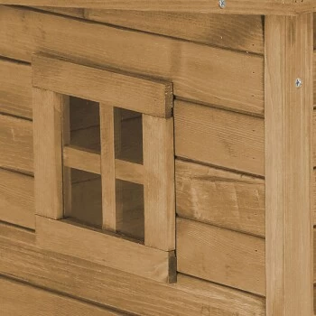 Die Fenster aus Plexiglas sorgen für einen Überblick Ihrer Katze und Licht im Inneren. Das Haus ist bereits mit Holzschutzfarbe lasiert und somit vor jeglichen Witterungseinflüssen geschützt. Die höhenverstellbaren Kunststofffüße schützen vor Bodenkälte.