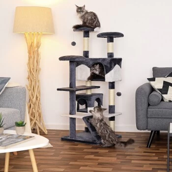 - IDEALES SPIEL- UND RUHEPARADIES. Die Ausstattung dieses Katzenbaumes mit einer Treppe und 2 Plüschbällen befriedigt den Spiel- und Jagdtrieb Ihrer Katze. Die geräumigen Höhlen und 3 gemütliche Liegeplateaus unterstützen die benötigten Ruhephasen und das beliebte Beobachten
