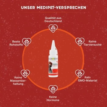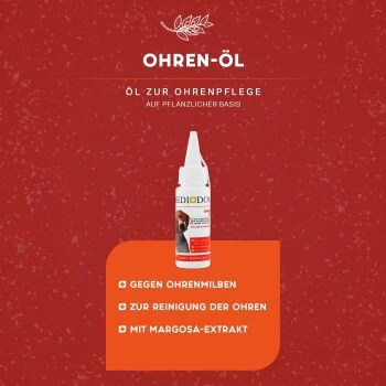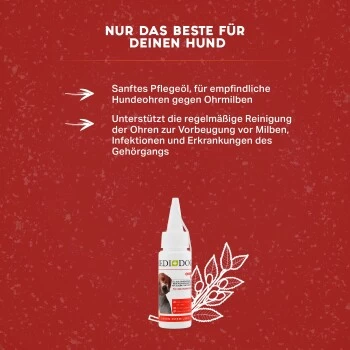Mit dem naturreinen, sanften Medidog Ohren-Öl schützt und pflegst du die empfindlichen Ohren deiner Fellnase. Das hochwertige alkoholfreie Pflegeöl für alle Hundeohren kann deinen Hund gleichzeitig vor lästigen Ohrenmilben und Infektionen im Ohr und im Gehörgang schützen. Die richtige und vor allem regelmäßige Reinigung seiner Ohren ist enorm wichtig für die Gesundheit deines Hundes.