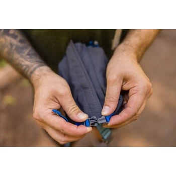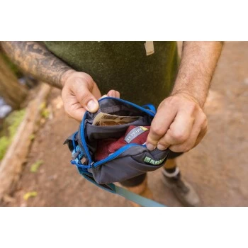 Die große Tasche mit Reißverschluss verfügt über kleinere Fächer für eine interne Ordnung. Die Klettmanschette wird am Leinengurt befestigt und ein Gurt hält sie an Ort und Stelle. Außentasche aus Stretch-Mesh für die Dinge, die man auch mal schnell greifen muss.